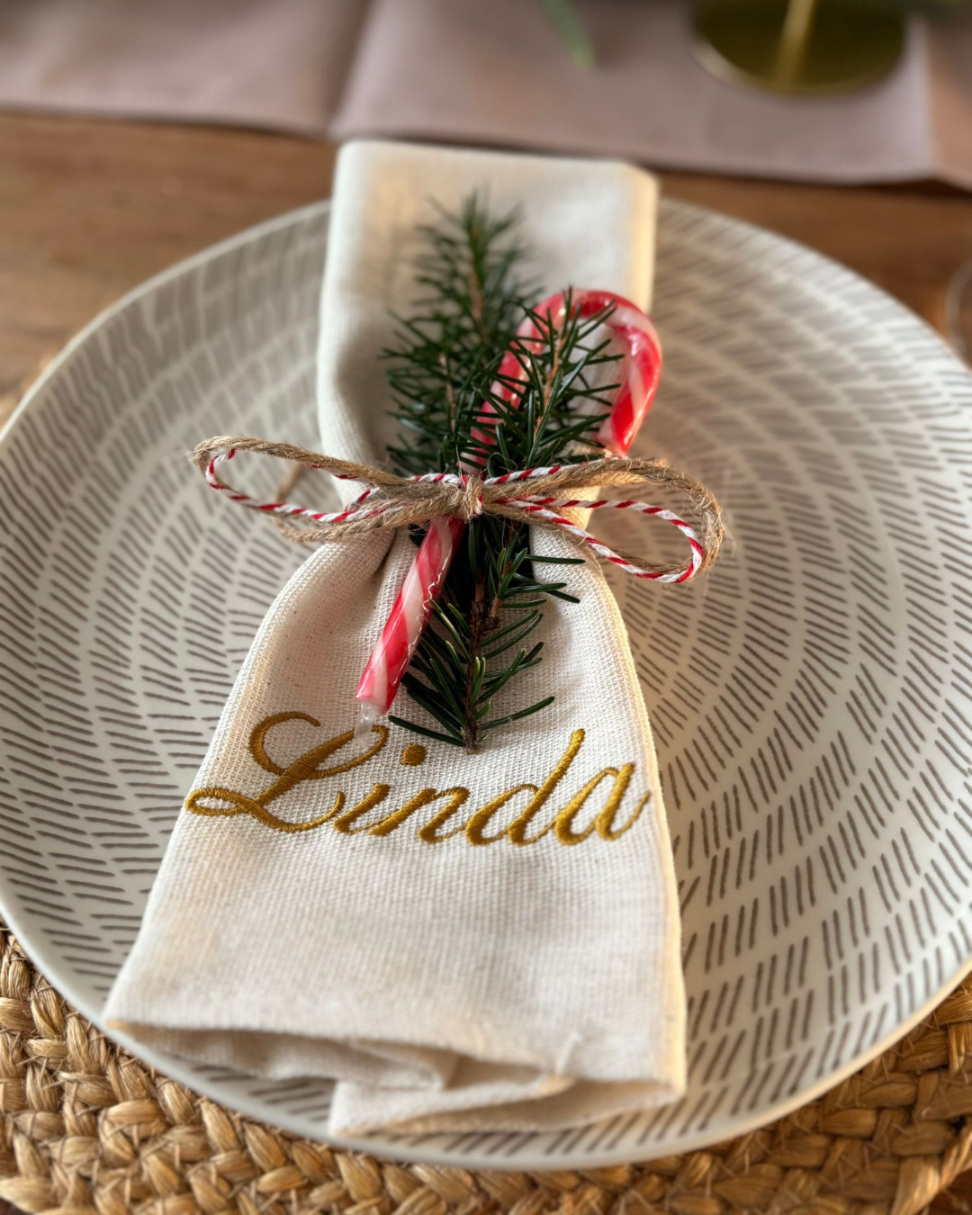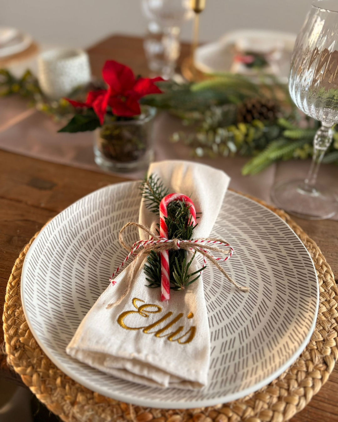 Geef je kerstdiner een stijlvolle upgrade met deze gepersonaliseerde servetten met naam. Een klein detail dat direct zorgt voor een feestelijke, persoonlijke tafel perfect voor kerst, maar ook mooi voor andere diners en speciale momenten.